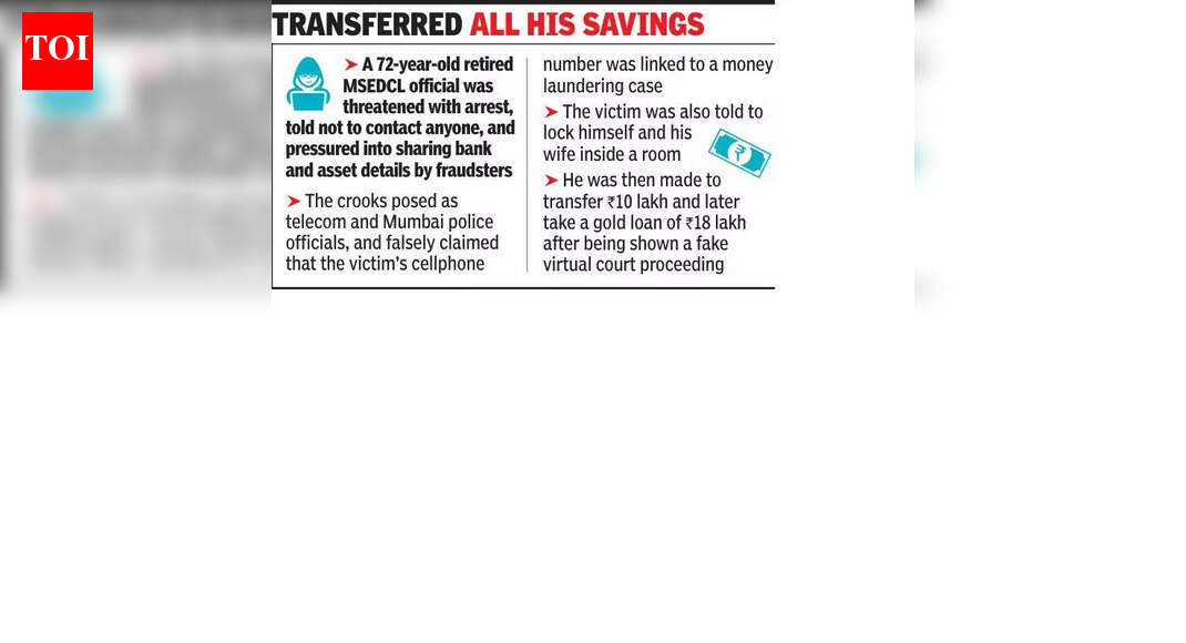 “कॉलरने पीडितेला घरी परत येण्याची आणि कोणाशीही चर्चा न करण्याची सूचना केली. पीडितेला सांगण्यात आले की त्याचे नाव मनी लाँड्रिंग प्रकरणात समोर आले होते आणि अटक वॉरंट जारी करण्यात आले होते,” अधिकाऱ्याने सांगितले.घरी पोहोचल्यानंतर कॉलरने पीडितेला स्वत:ला आणि पत्नीला एका खोलीत बंद ठेवण्यास सांगितले. पीडितेच्या बँक खात्यातून 2 कोटी रुपयांचे संशयास्पद व्यवहार झाल्याचा दावा कॉलरने केला आहे. त्यानंतर, दुसऱ्या व्यक्तीने, वरिष्ठ पोलीस अधिकारी म्हणून दाखवून, कॉलमध्ये सामील झाले आणि पीडितेला संभाव्य अटकेचा इशारा दिला, त्याला 538 कोटी रुपयांच्या मोठ्या आर्थिक फसवणुकीच्या प्रकरणाशी खोटे जोडले.“कॉलरने पीडितेला असेही सांगितले की व्यावसायिकाचे साथीदार पीडितेची हत्या करू शकतात, त्यामुळे त्याच्या घराबाहेर साध्या वेशातील पोलिस तैनात करण्यात आले आहेत,” अधिकारी म्हणाला.कॉलरने, पीडितेला घाबरवण्यासाठी, असेही सांगितले की व्यावसायिकाच्या सहाय्यकांनी एका व्यक्तीच्या मुलीवर लैंगिक अत्याचार केले ज्याने न्यायालयात व्यावसायिकाचे नाव उघड केले आणि त्याची पत्नी आणि मुलाची हत्या केली. “कॉलरने पीडितेला असेही सांगितले की दिल्ली आणि झारखंडच्या माजी मुख्यमंत्र्यांना अशाच एका गुन्ह्यात अटक करण्यात आली होती आणि त्यांना त्यांच्या पदांचा राजीनामा द्यावा लागला. बदमाशांनी नंतर त्याच्या बँक बॅलन्स आणि मालमत्तेचा तपशील घेतला आणि 4 डिसेंबर रोजी त्याला 10 लाख रुपये एका बँक खात्यात हस्तांतरित केले,” अधिकाऱ्याने सांगितले.दुसऱ्या दिवशी, फसवणूक करणाऱ्यांनी कथितरित्या एक बनावट आभासी सर्वोच्च न्यायालयाची कार्यवाही केली, ज्यामध्ये न्यायाधीश आणि वकील म्हणून ओळखल्या जाणाऱ्या व्यक्तींचा समावेश होता आणि पीडितेला गुप्तता राखण्याची सूचना दिली. नंतर त्याला त्याच्या सोन्याच्या दागिन्यांची छायाचित्रे शेअर करण्यास सांगितले आणि ते गहाण ठेवण्यास प्रवृत्त केले. पीडितेने 18 लाख रुपयांचे सोने कर्ज घेतले आणि ती रक्कम दुसऱ्या बँक खात्यात हस्तांतरित केली, असे अधिकाऱ्याने सांगितले.बदमाशांनी 13 डिसेंबरपर्यंत पीडितेशी संपर्क साधला आणि इतर गुंतवणुकीबाबत चौकशी केली. अखेर पीडितेने आपल्या मुलाला याची माहिती दिली, त्यानंतर आपली फसवणूक झाल्याचे लक्षात आले. “आपली फसवणूक झाल्याचे लक्षात आल्यानंतर, पीडिता आणि त्याच्या मुलाने पोलिसांकडे जाऊन 26 डिसेंबर रोजी तक्रार दाखल केली,” तो म्हणाला.तेलंगणातील जगतियाल आणि बेंगळुरू येथील दोन खाजगी बँक खात्यांमध्ये पैसे हस्तांतरित करण्यात आल्याचे आतापर्यंतच्या तपासात समोर आले आहे. “आम्ही व्यवहाराचे तपशील मागितले आहेत आणि पुढील तपास सुरू आहे,” असे अधि